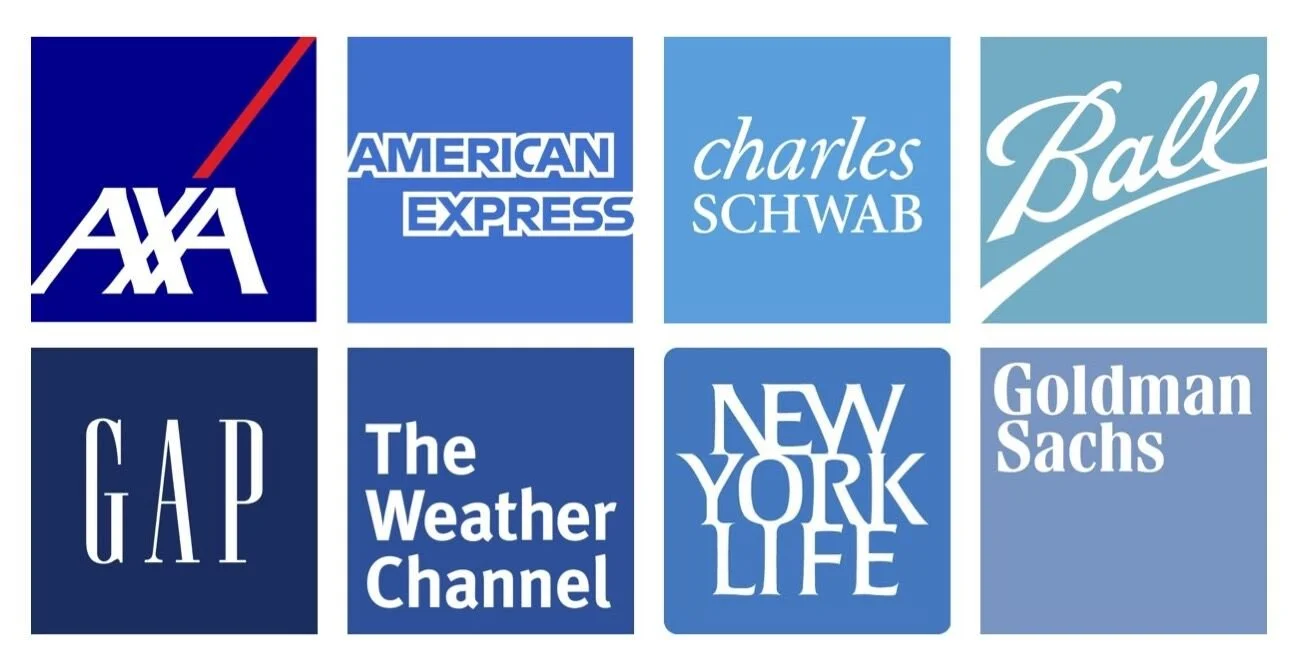 The blue square combines simple geometry with a calming, confident, and corporate color. The blue square focuses attention on perhaps the most important part of the brand identity, the name. The blue square is efficient and stacks up well on step and repeat banners. The blue square is also incredibly easy to use. It has built-in background control, meaning you can put it on any image or campaign and not have it interfere with the legibility.